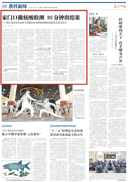 “疫情发生之后,我们接到很多国家层面的研发任务,做相关的应急研发。比如说前期防疫情输入,有些口岸连像样的医院都没有,更不具备先进的核酸检测手段,但新冠病毒又是烈性病毒,所以急需开发一种在普通环境下可以做检测的封闭式、全自动的车载式快速响应实验室。”中国工程院院士、清华大学医学院讲席教授、生物芯片北京国家工程研究中心主任、博奥生物集团总裁程京介绍,这是一个联合攻关的过程:在采集咽拭子的过程,要避免人工操作,所以要研发口腔咽拭子取样机器人;病毒快速灭活需要自动化,需要研发临床样本灭活前处理仪;中国各地检测现场气候、气温差异大,要保持一个稳定恒温的环境,就要做车载式检测实验室、改装汽车……