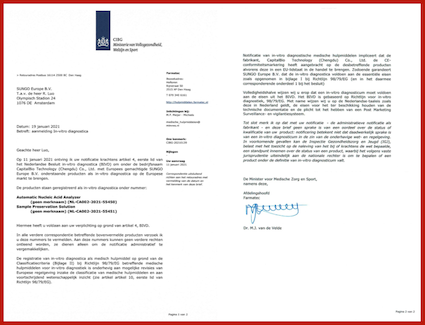 ? ? ? 近日,博奥j9九游会官网联合清华大学成功研发的由新型冠状病毒2019-nCoV核酸检测试剂盒(全集成碟式芯片法),英文名称:SARS-CoV-2 Nucleic Acid Detection Kit (Integrated Isothermal Amplification Chip Method)和全自动核酸分析仪,英文名称:Automatic Nucleic Acid Analyzer组成的全集成芯片实验室系统获CE准入资质(证书号:NL-CA002-2021-55957和NL-CA002-2021-55450),获CE准入资质表明该产品符合欧盟医疗器械相关指令的符合性要求,具备欧盟市场的准入条件,将为欧洲地区的新冠疫情防控工作提供高灵敏度全集成快速检测工具。