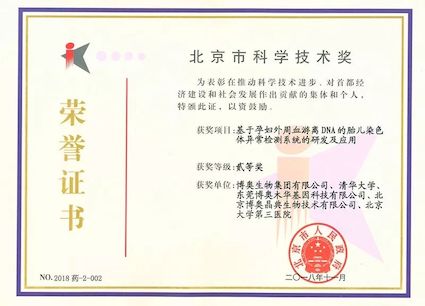 另外,与本产品相关的“基于孕妇外周血游离DNA的胎儿染色体异常检测系统的研发及应用”荣获2018年度北京市科学技术奖二等奖。