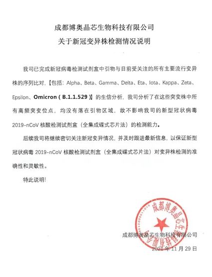 目前,旗下成都博奥晶芯生物科技有限公司已完成新冠病毒检测试剂盒中引物与目前主要流行变异株的序列比对【包括但不限于:Alpha、Beta、Gamma、Delta、Eta、Iota、Kappa、Zeta、Epsilon、Omicron(B.1.1.529)】,结果证实:博奥j9九游会官网已上市的新型冠状病毒2019-nCoV核酸检测试剂盒(全集成碟式芯片法),不会出现脱靶和漏检的情况。后续,博奥j9九游会官网将持续紧密追踪全球新冠病毒变异株的最新动态并及时跟进最新信息,确保全集成新冠病毒核酸检测芯片试剂盒对变异株检测的准确性和灵敏性。