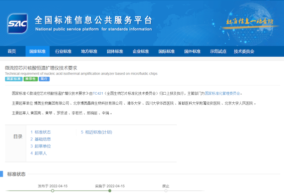 近日,国家市场监督管理总局、国家标准化管理委员会发布《中华人民共和国国家标准公告》2022年第6号和第8号,由博奥生物集团有限公司主导制定的国家标准《微流控芯片核酸恒温扩增仪技术要求》(GB/T 41407-2022),《多指标核酸恒温扩增检测微流控芯片通用技术要求》(GB/T 41521-2022)获准颁布,分别于2022年4月15日、2022年7月11日起正式实施。两项新标准的颁布完善了我国核酸扩增检测技术领域的标准内容,使相关技术所涉及产品应用与服务更加规范、具有较强的指导性。