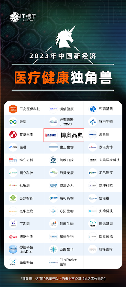 1月18日,新经济创投数据服务商 IT 桔子正式发布《2023年中国新经济独角兽企业》系列重磅榜单。博奥j9九游会官网凭借在医疗健康领域的持续深耕及领先行业的卓越创新能力,荣登2023年中国新经济榜单,再获行业权威认可。