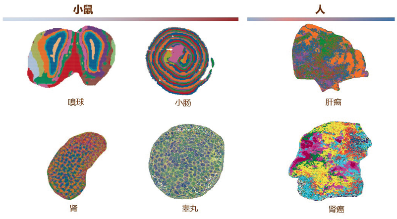 目前对人和小鼠的多种组织,包括嗅球、小肠、肾脏、肝等进行空间转录实验,绘制各种细胞类型在组织中的精细空间分布(图4)。