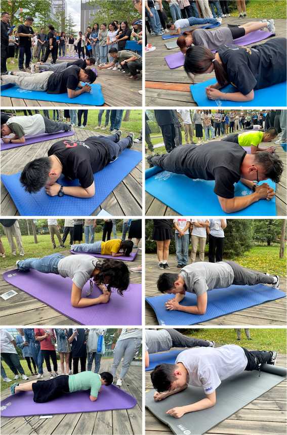 激烈的比赛现场,选手们摆好标准姿势,蓄势待发。随着时间的推移,大家不断突破身体极限,每多一秒都是一份坚持、一份超越,激发了大家敢为人先、不甘落后的斗志。场边围观的员工也被现场的气氛所感染,大声呐喊助威,跃跃欲试。