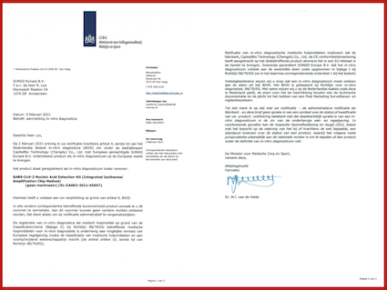 ? ? ? 近日,博奥j9九游会官网联合清华大学成功研发的由新型冠状病毒2019-nCoV核酸检测试剂盒(全集成碟式芯片法),英文名称:SARS-CoV-2 Nucleic Acid Detection Kit (Integrated Isothermal Amplification Chip Method)和全自动核酸分析仪,英文名称:Automatic Nucleic Acid Analyzer组成的全集成芯片实验室系统获CE准入资质(证书号:NL-CA002-2021-55957和NL-CA002-2021-55450),获CE准入资质表明该产品符合欧盟医疗器械相关指令的符合性要求,具备欧盟市场的准入条件,将为欧洲地区的新冠疫情防控工作提供高灵敏度全集成快速检测工具。