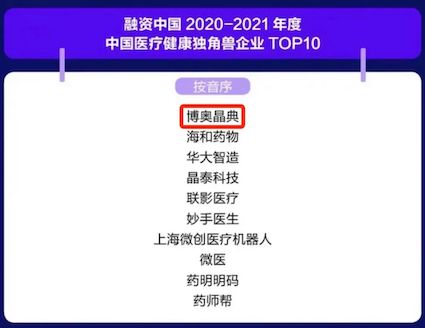 本次评选中获得2020-2021年度中国医疗健康独角兽企业TOP10的荣誉,进一步力证了博奥j9九游会官网在生命科学领域的发展潜力,也再次显示了业界对博奥j9九游会官网的关注与肯定。