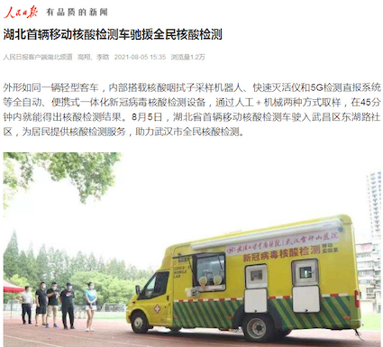 “上门检测,当场就可以拿到结果。”酷暑下,湖北武汉有这样一台新冠病毒核酸检测“神器”。它45分钟即可完成全程实验,最快35分钟报告阳性结果,检测灵敏度可达150拷贝/毫升。今天,博奥j9九游会官网原创的新冠病毒核酸检测移动实验室加盟武汉大学中南医院、武汉雷神山医院核酸检测团队,正式投入使用。作为湖北首台移动核酸检测车,助力全民疫情防控。