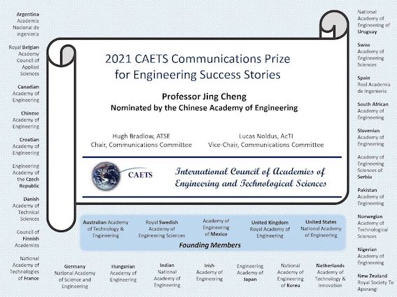 国际工程院理事会是世界各国国家级工程院的联合组织,由分布在六个大洲的31个成员院组成。2021年初,CAETS启动了首届“CAETS传播奖”的征集评选工作。作为CAETS成员,中国工程院开展了“2021年CAETS传播奖”国内参赛作品的征集和评选工作,程京院士带领清华及博奥团队共同研制成功的“全集成新冠病毒核酸检测芯片实验室”成果视频,获中国工程院推荐参选。经过在国际范围内的激烈角逐,本国作品最终摘得首届唯一的“2021 CAETS传播奖-工程成就奖”,充分展示了中国抗疫先进技术的国际领先水平。