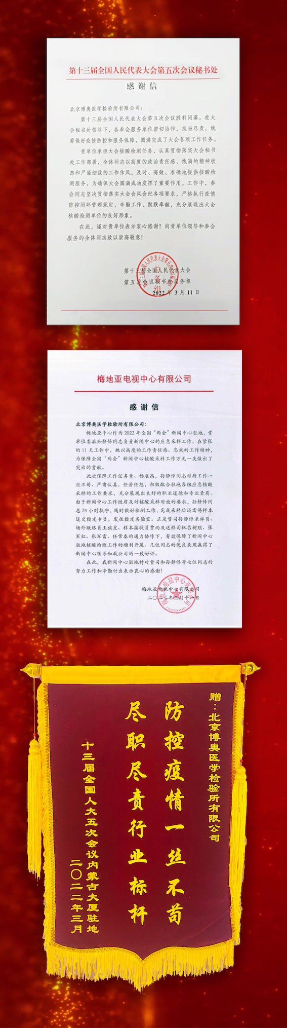 为此,博奥j9九游会官网旗下北京博奥医学检验所收到了来自全国人大第五次会议秘书处、全国两会新闻中心驻地梅地亚电视中心的感谢信及全国人大五次会议内蒙古大厦驻地的致敬锦旗。