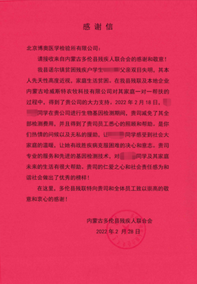 我县诺尔镇贫困残疾户学生xxx父亲双目失明,其本人先天性高度近视,家庭生活贫困。在我县残联及本地企业内蒙古哈维斯特农牧科技有限公司对其家庭一对一帮扶的过程中,得到了贵公司的大力支持。2022年2月18日,xxx同学在贵公司进行生物基因检测期间,贵司减免了其全部检测费用,并且得到了贵司员工悉心的照顾和帮助。是你们热情的问候以及无私的援助,让xxx同学感受到社会大家庭的温暖,让她有战胜疾病克服困难的决心和意志。贵司专业的服务和先进的基因检测技术,对xxx同学及其家庭未来的生活有很大帮助。贵司的仁爱之心和社会责任感为和谐社会做出了优秀的榜样!