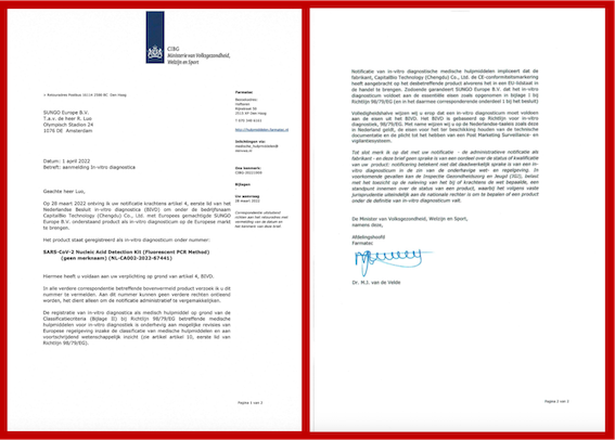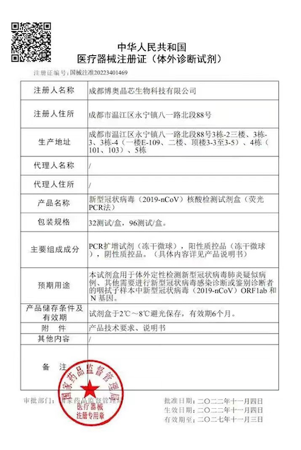 2022年11月4日,博奥j9九游会官网新冠病毒核酸检测整体解决方案再添新成果,冻干型高灵敏度的新型冠状病毒(2019-nCoV)核酸检测试剂盒 (荧光PCR法)正式获得医疗器械注册证(国械注准:20223401469)。这是国家药品监督管理局审批通过的首个冻干型新冠病毒核酸检测试剂盒,同时具备中国NMPA和欧洲CE“双证”,为坚持“动态清零”,全面加强常态化疫情防控能力建设提供全新战疫利器。