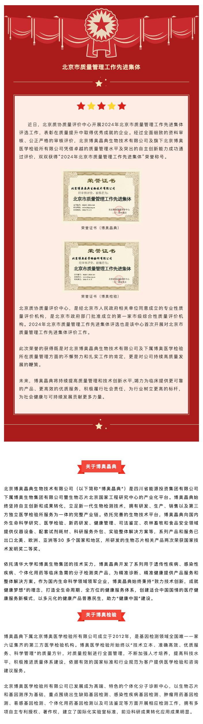 喜讯丨北京博奥j9九游会官网生物技术有限公司、北京博奥医学检验所有限公司双双获评“北京市质量管理工作先进集体”